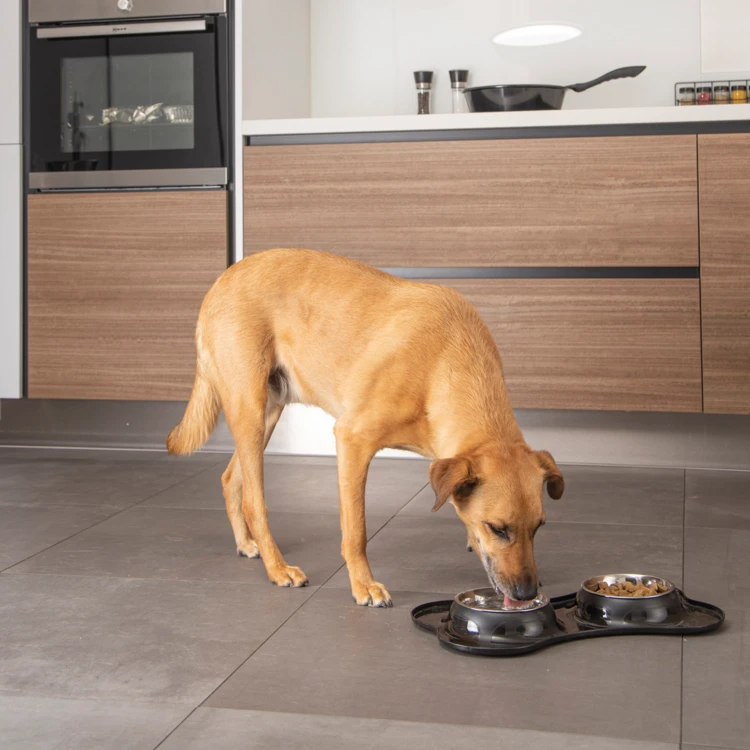 Double bol en inox avec une partie antidérapante formant un os, idéal pour que rien ne bouge le temps du repas.