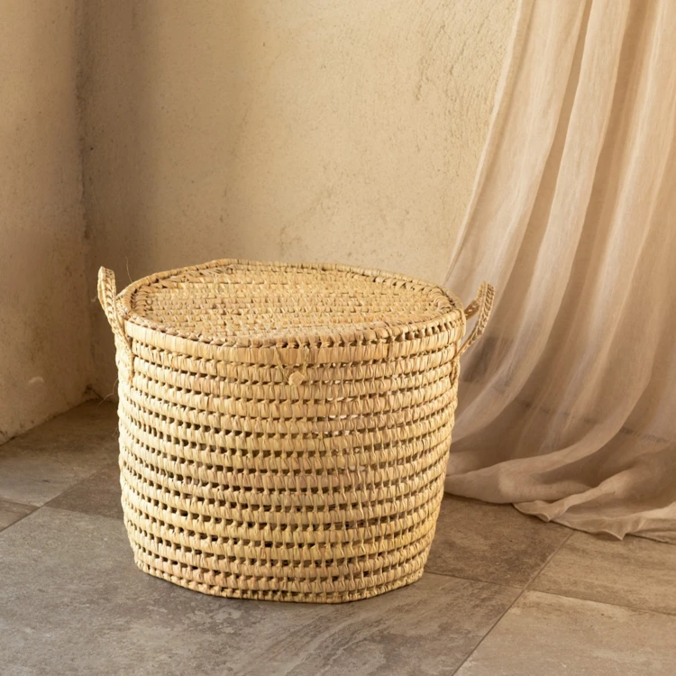 Apportez une touche naturelle et bohème à votre intérieur avec cette grande malle ronde en feuilles de palmier Doum séchées. Parfaite pour ranger linge, jouets, plaids ou autres trésors, elle s’adapte à tous vos besoins. Fabriquée à la main par des artisans marocains, chaque malle est unique grâce à son tressage authentique et ses matériaux naturels. Avec son couvercle, elle peut également servir de table d’appoint pratique et décorative.