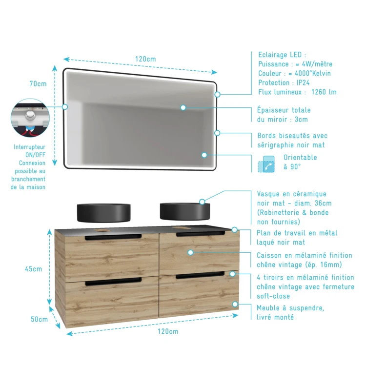 L’ensemble est équipé de 2 vasques rondes à poser en céramique noire et un miroir rectangulaire éclairant à led noir qui apporteront du caractère et un esprit industriel à votre pièce.