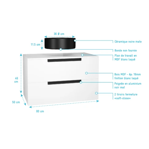 - Matériaux : Caisson en MDF et mélaminé (ép. 15 mm) laqué mat