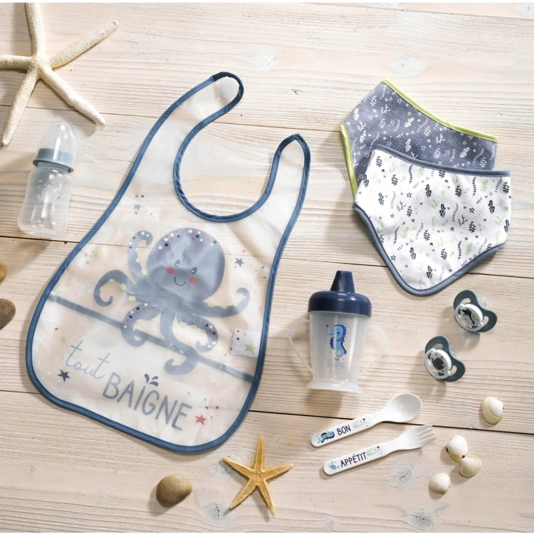 Lot de 2 bavoirs aux motifs marins, qui protègeront le cou et les vêtements du lait et des reflux de votre bébé!