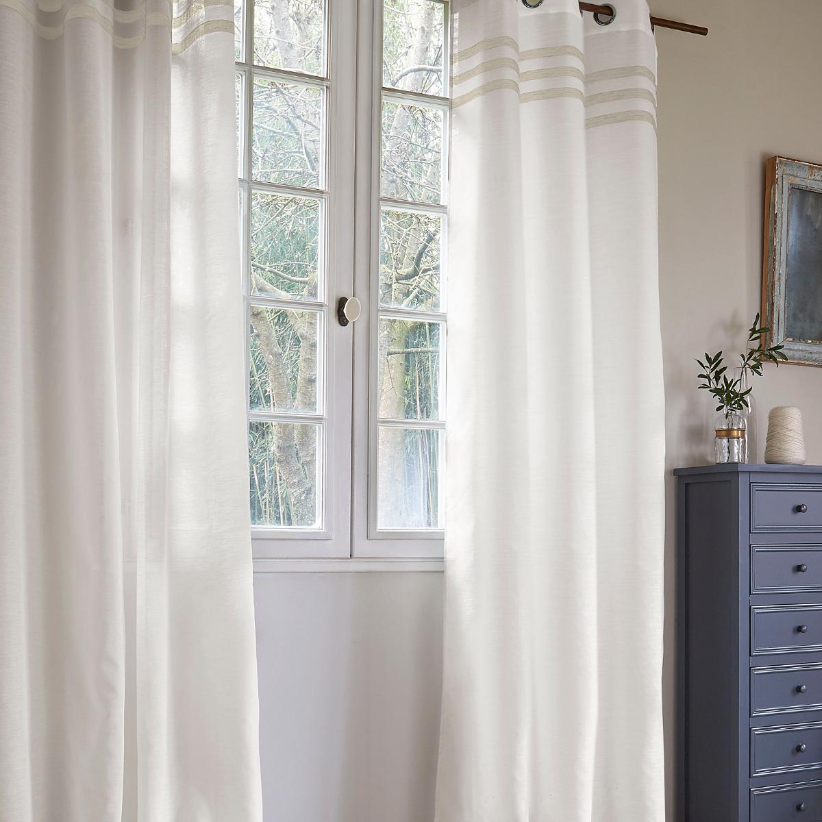 Caractéristiques: Dimensions: 140 x 240 cm, Finition: 8 oeillets ronds en coloris argent avec un diamètre intérieur de 4 cm, Coloris: blanc, lin et gris, Composition: 87% polyester, 10% lin et 3% modal