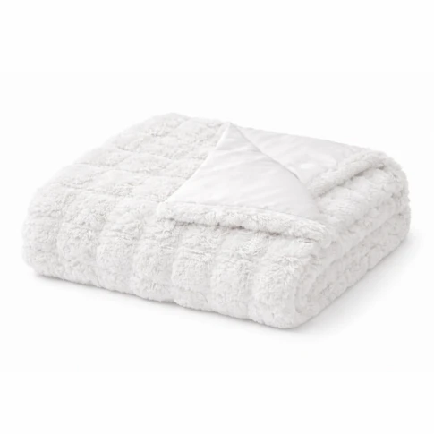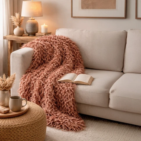 Plaid ou jeté de lit en fausse fourrure : Ils sont souvent utilisés pour se réchauffer pendant les mois d'hiver ou pour ajouter une touche de luxe à une pièce.