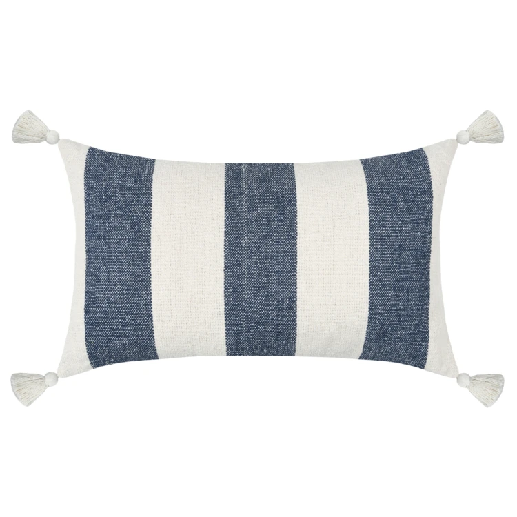 Son design à bandes bleues, agrémenté de pompons raffinés, insuffle une ambiance estivale et conviviale dans votre salon ou votre chambre. Ce coussin est l'accessoire idéal pour allier confort et esthétique dans une décoration inspirée de l'océan.