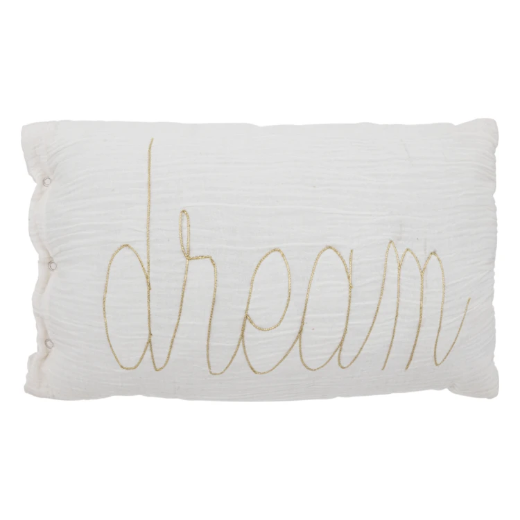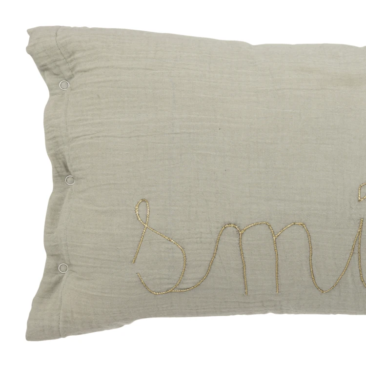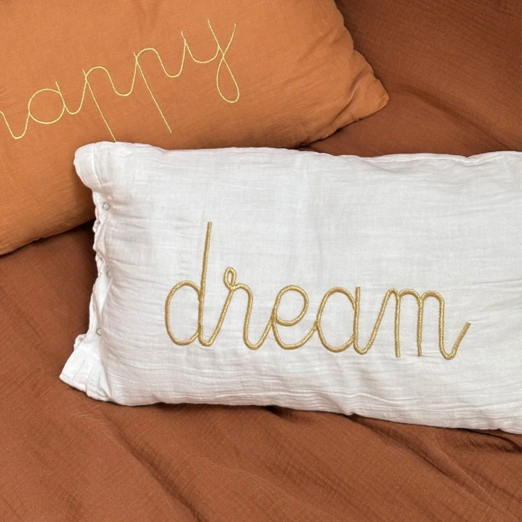 Ajoutez une touche d'élégance à votre espace avec notre coussin en gaze de coton, orné d'une inscription brodée.