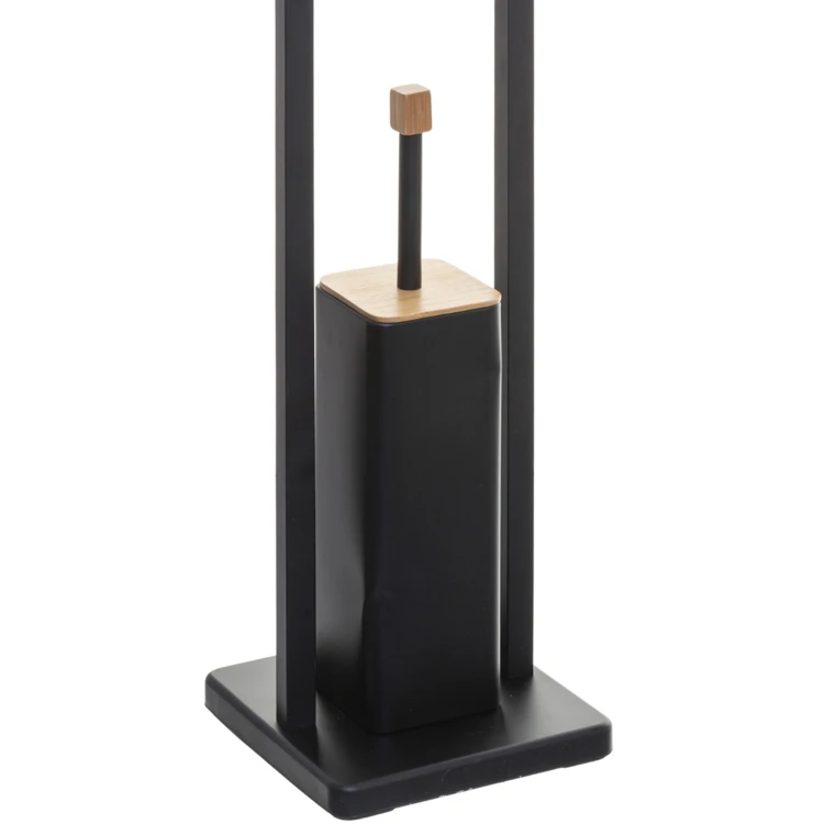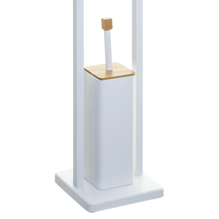 Nous vous proposons ce dérouleur de papier toilette en métal blanc ou noir avec son couvercle en bambou qui se termine par un pot avec une brosse sur le bas.