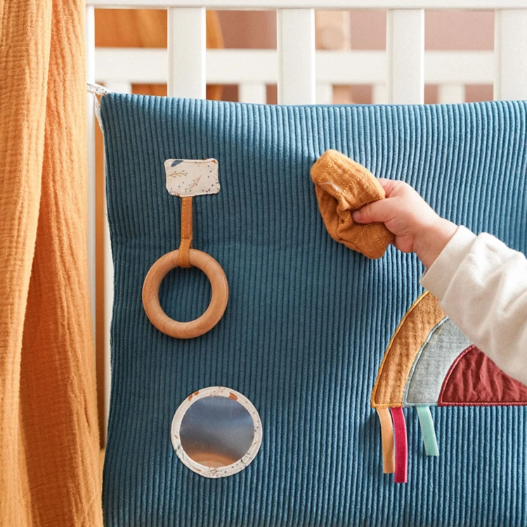 - Polyvalent : Utilisable comme tapis d'éveil au sol ou accroché aux barreaux du lit grâce à ses liens à nouveau.