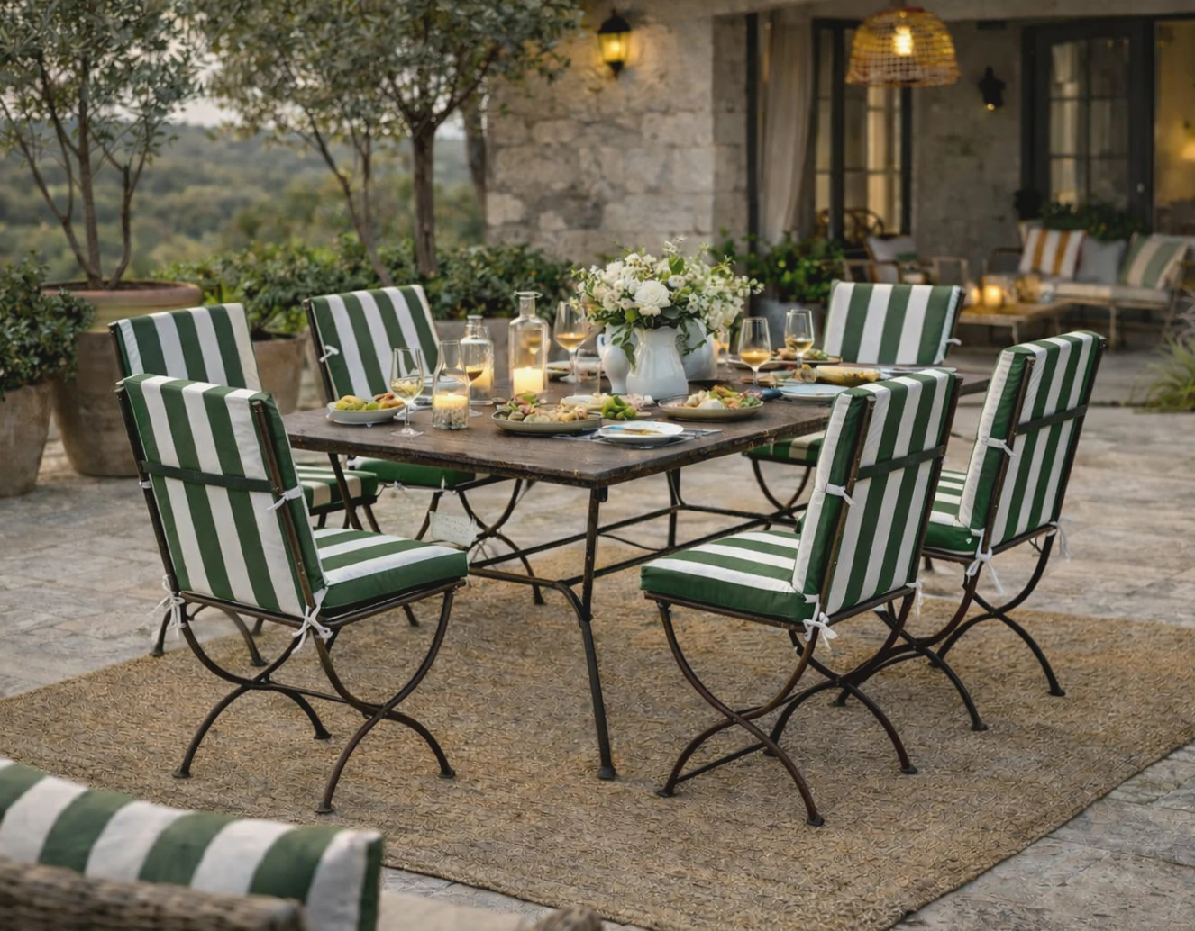Die Kollektion Arcachon gehört voll und ganz zur Outdoor-Welt und überzeugt mit ihrem unverwechselbaren „Küstenstil“-Design. Sie basiert auf breiten, ikonischen weißen Streifen, kombiniert mit modernen Farbtönen wie Leinen, Gelb, Dunkelblau oder Olivgrün, die an die natürliche und gesellige Eleganz des Meeresrandes erinnern. Diese Farbkombinationen verleihen Ihren Gartenmöbeln Rhythmus und Charakter und schaffen zugleich eine sommerliche und raffinierte Atmosphäre. Die Kollektion ist in mehreren Kissengrößen erhältlich, bis hin zum XXL-Format 70x70 cm, sowie als Sonnenliegenauflagen und Sitzkissen für Stühle und Sessel. Gefertigt aus beschichtetem Outdoor-Gewebe, wasserabweisend und UV-beständig, vereint die Kollektion Arcachon Ästhetik und Schutz gegenüber äußeren Bedingungen. Die großzügige Füllung aus synthetischen Fasern sorgt für einen umhüllenden und langlebigen Komfort – ideal, um lange entspannte Stunden in der Sonne zu genießen. Für den täglichen Gebrauch konzipiert, ist jedes Stück mit sicheren Befestigungssystemen aus Bändern und Clips ausgestattet, die eine perfekte Stabilität auf den Möbeln gewährleisten.