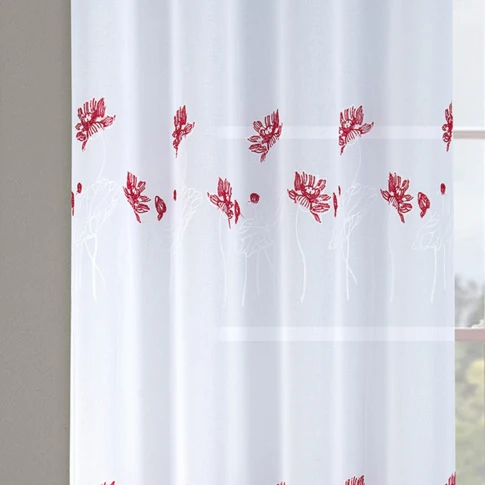 Los motivos tejidos, que representan tazas de café acompañadas de las inscripciones "latte" y "espresso", evocan un ambiente cálido y acogedor, ideal para los amantes del café y los momentos de relax. El color blanco aporta luminosidad a la habitación mientras filtra suavemente la luz.