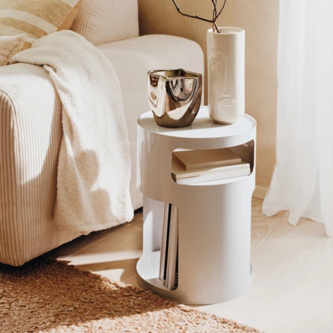 Mesa auxiliar redonda con compartimentos de almacenamiento