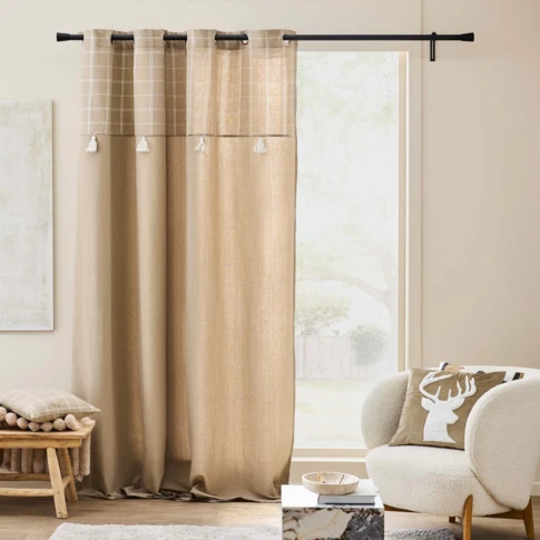 Rideau à œillets avec haut à carreaux et pompons en polycoton