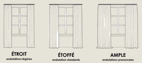 Plus la largeur du rideau sera importante, plus le rendu sera ondulé (oeillet, wave, passant, etc) ou froncé (galon fronceur).
